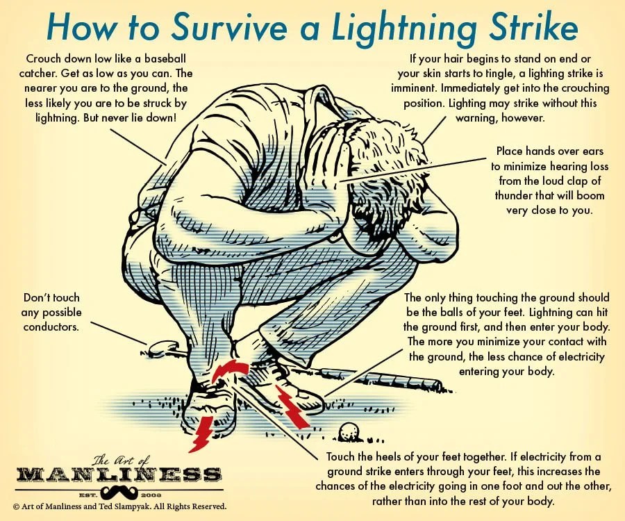 - Crouch low on the balls of your feet, feet together, hands over ears. Minimize your height and ground contact area simultaneously.