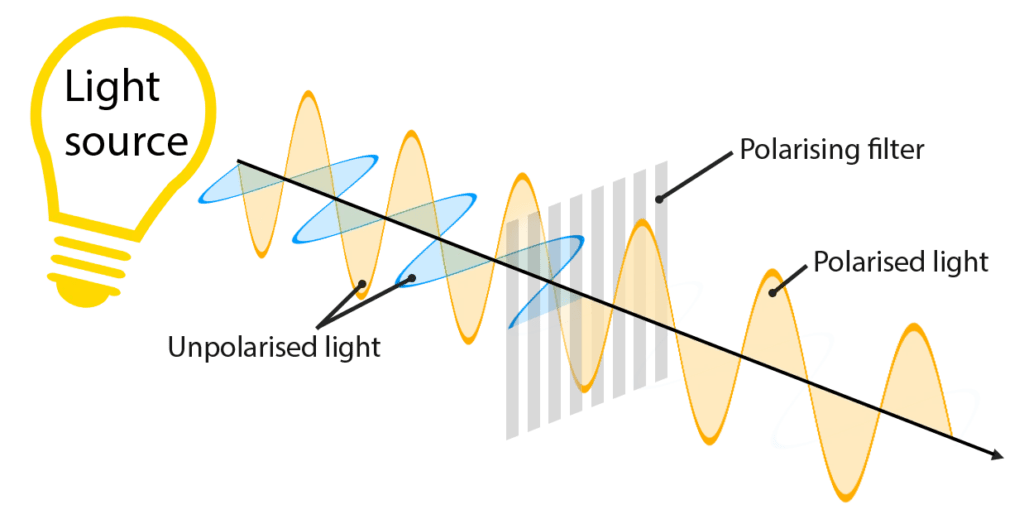 Light is an electromagnetic wave. Its electric field oscillates as the wave propagates, and the direction of oscillation is the polarization. Ordinary light (sunlight, lightbulb light) is unpolarized: the electric field oscillates in all directions equally, rotating randomly over time.