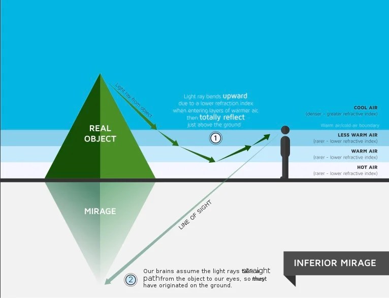 From your eye, this curved ray appears to come from below the horizon, creating an inverted image of the sky. Your brain interprets a shimmering blue patch below the horizon as water — because that's what a shimmering blue patch below the horizon almost always is.