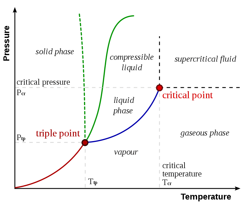 Following the liquid–gas boundary upward in pressure and temperature, it doesn't go on forever. It ends at the critical point — for water, 647.1 K and 22.06 MPa. Above the critical point, the distinction between liquid and gas disappears entirely, and the substance becomes a supercritical fluid: a single continuous phase with properties of both liquid and gas simultaneously.