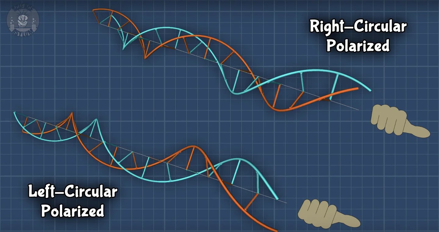 Modern movie theaters use circular polarization to solve the head-tilt problem. Instead of oscillating in one fixed direction, the electric field of circularly polarized light rotates as the wave propagates — either clockwise (right-circular polarization, or RCP) or counterclockwise (left-circular polarization, or LCP).